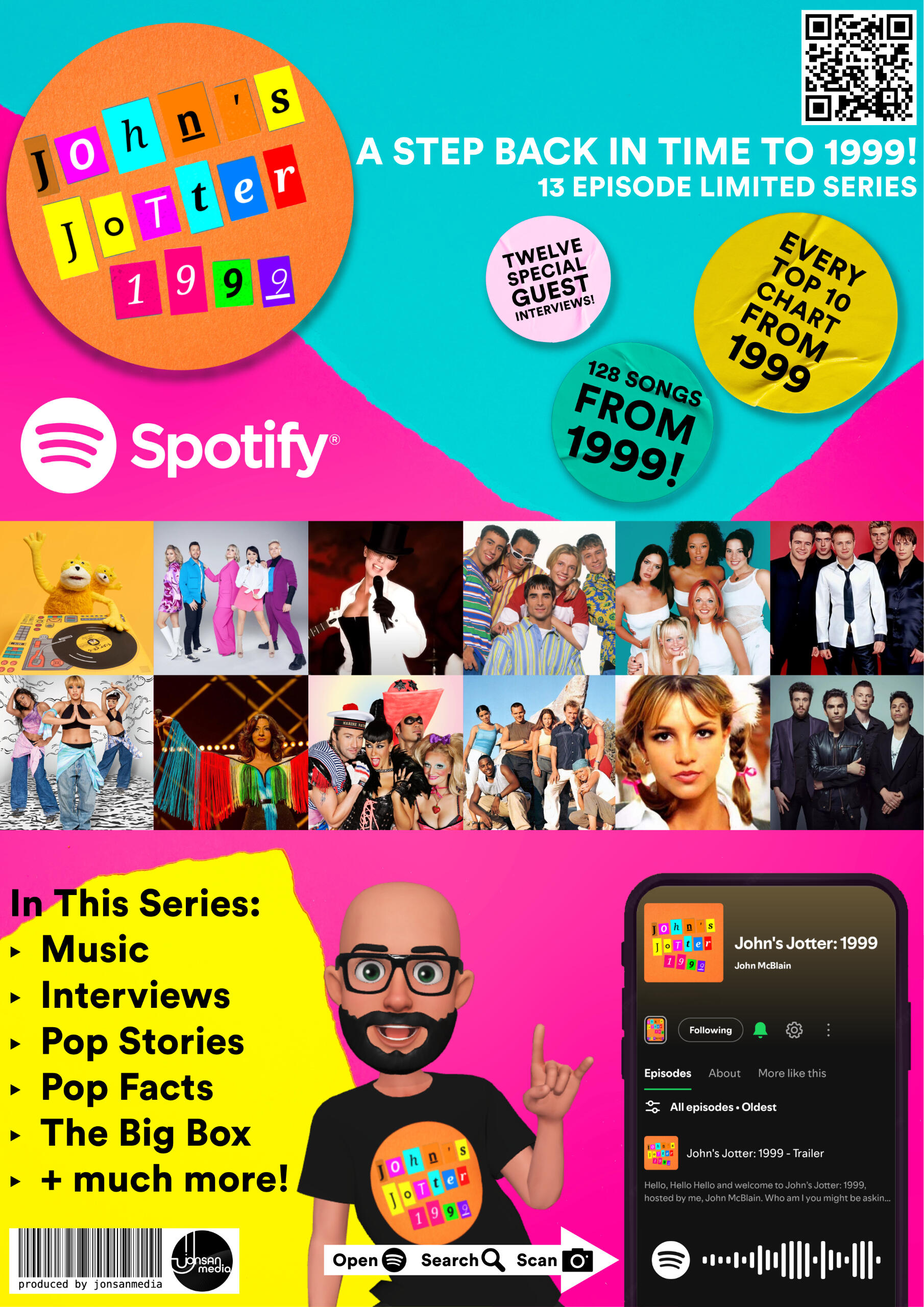 John's Jotter: 1999 is a music & chat show podcast series hosted & produced by John McBlain available exclusively on Spotify.It all started with a found relic from John's school days way back in 1999 - a school maths jotter covered in stickers, cut outs from magazines and newspapers coupled with every Top 10 Singles Charts handwritten from across the year!Fast forward a few years and decades and John found the jotter and turned it into a podcast series and this here visual galley of CD singles, posters & postcards from CD singles, promo stuff sent through the post and much more!Starting with an episode taking 'A Step Back In Time' explaining the origins of the jotter, join John and his special guests for 12 episodes, 52 Top 10 singles charts run downs and a whole load of 90s chat, games and much more!Make sure to check out the Visualiser App while you listen to see photo galleries of CD singles, 90s memorabilia, photographs + much more from each episode and month of the year from 1999!Explore the app to find out more and make sure to listen and follow John's Jotter 1999 on Spotify!